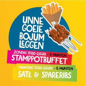Bij carnaval heurt natuurlijk wel unne goeie bojum leggen. Op zondag hebben wij un heerlijk stamppotbuffet en op maandag saté & spareribs zodat ge zeker wit da ge het makkelijk volhoud.